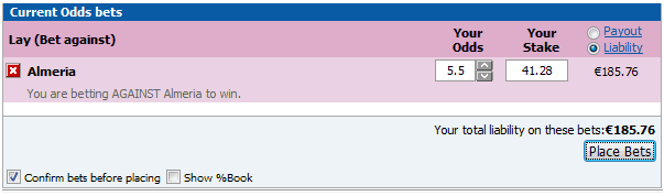 U Betway vsadíte 50 EUR bonus na Almerii s kurzem 5,5. U Betfair nám kalkulačka po zadání kurzů obou bookmakerů, výše sázky u Betway, poplatku a informace, že se s případnou výhrou u Betway bonusová částka nevrací spočítá, že musíme vsadit 41,28 EUR.